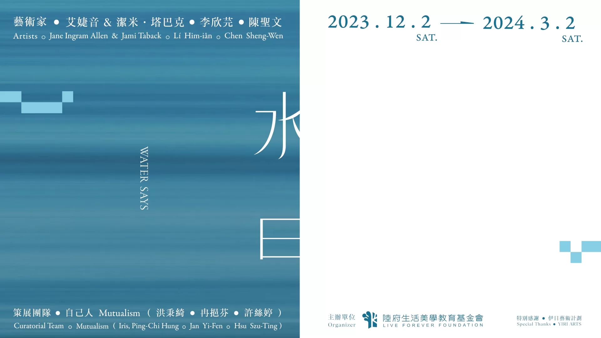 長期致力於結合自然生態與藝術、推動環境倡議的 陸府生活美學教育基金會 與策展團隊「自己人」從環境變動議題出發,邀請三組藝術家:艾婕音 (Jane Ingram Allen) 與潔米 · 塔巴克 (Jami Taback) 雙人組、李欣芫、陳聖文,以手製紙、版畫、聲音、纖維與染料等多元媒材作為載體,傾訴「水」在太平洋兩端的日常,並從中探討因果循環、自然和可持續性之間的矛盾。